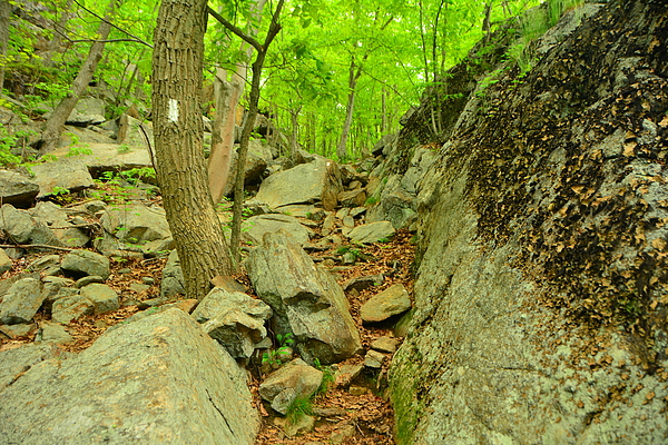 A rocky trail weaves through a lush, green forest, highlighted by a tree marked with a white blaze indicating the path. Large boulders and... more