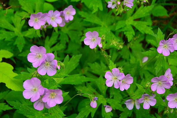 Delicate pink flowers are scattered amidst lush green foliage, creating a vibrant scene. The soft petals and verdant leaves produce a balanced... more